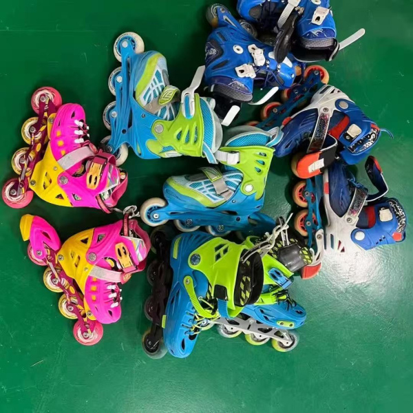 Colorful roller skating shoes for kids aged 6 to 18 with protective gear.