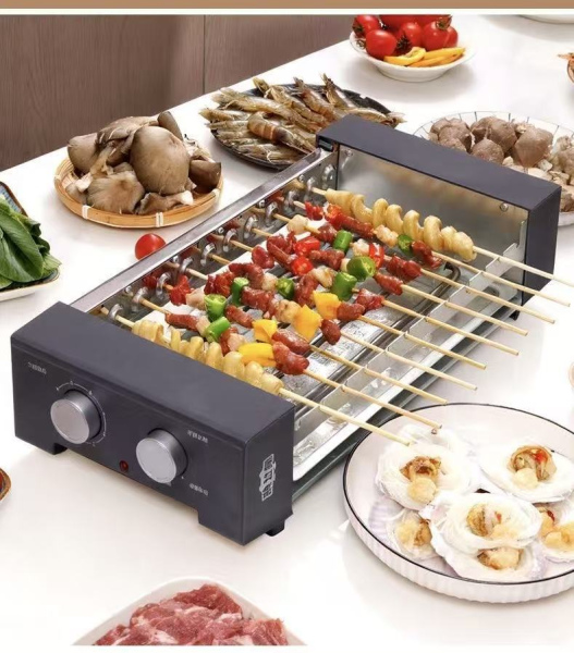 Modern electric grill for home use. Very convenient for BBQ with family. It can grill meats and veggies.