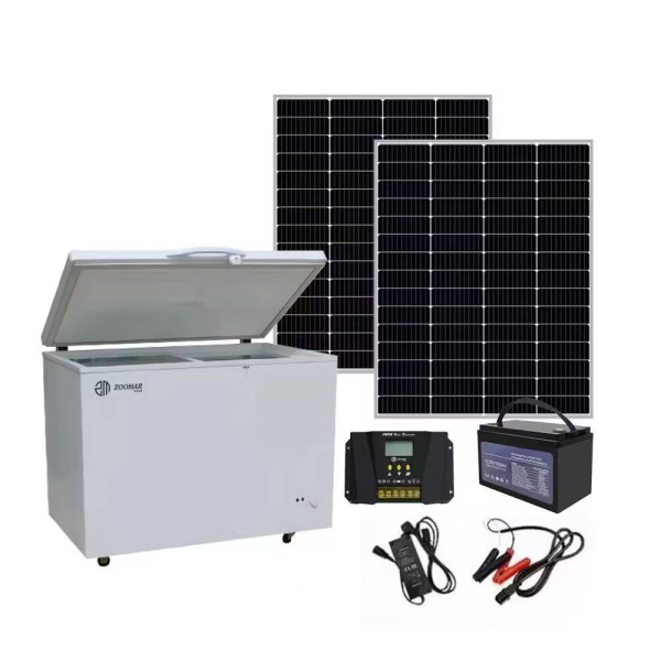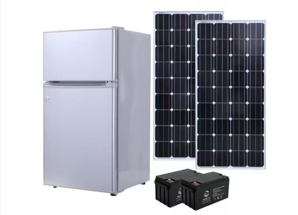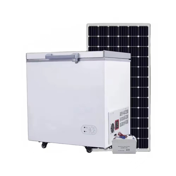 A modern solar-powered refrigerator for house use and commercial use with direct electricity grid connection option.